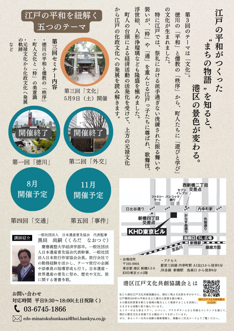 私たち港区江戸文化共創協議会は、港区に残る文化財を手がかりに、江戸幕府260年の平和を支えた徳川の思想を読み解き、その歴史的背景を新たな地域の魅力として発信することを目的に、さまざまな活動に取り組んでいます。